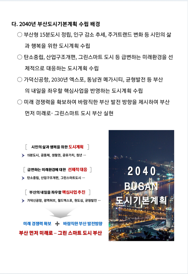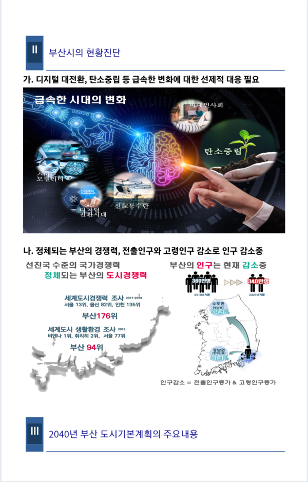 ‘2040 부산도시기본계획’에는 ‘부산 먼저 미래로 그린스마트 도시 부산’ 비전이 반영되고, 디지털 대전환 시대라는 새로운 패러다임과 저성장·저출산·고령화 시대로 접어드는 현대사회의 변화와 기후변화·감염병·4차산업혁명 등의 전 세계적인 이슈에 체계적이고 유연하게 대응할 부산의 미래가 담겨 있다.