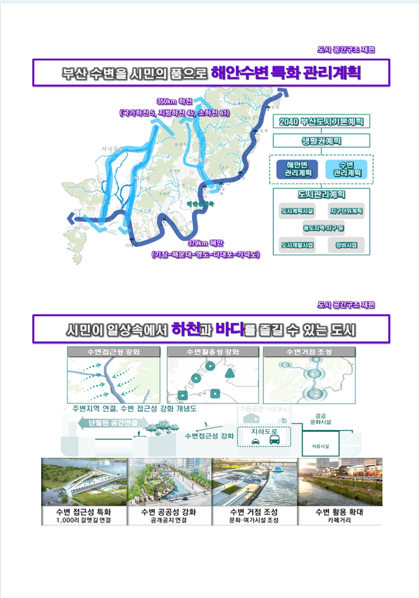 ▶부산시는 7개 해수욕장과 기장군에서 강서구에 이르는 379km 해안, 국가하천 5개와 지방하천 45개가 있는 물의 도시이므로, 시는 수변 공공성 확보를 위한 밀도 및 높이 관리 기준을 마련하고 수변 접근성 향상을 위한 가이드라인을 제시하며 수변 거점 조성 및 활용성 강화를 추진할 계획이다.