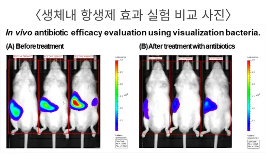 전임상센터의 과기부 이공분야기초연구사업(연구책임자 정의숙 선임연구원)을 통해 진행된 이 연구개발은 박테리아 엔지니어링을 통해 광학리포터 유전자를 탑재한 시각화 미생물을 제작하였으며, 해당 미생물을 이용하여 감염성 치료제 및 후보물질의 유효성 평가를 위한 최적화 감염동물모델을 제작했다.