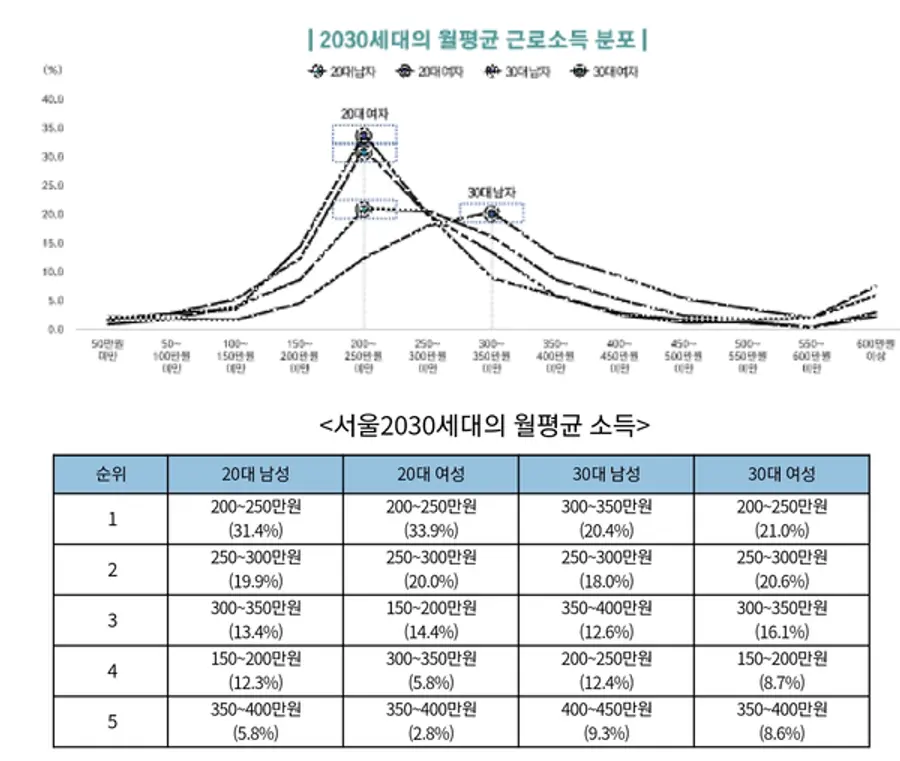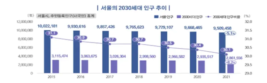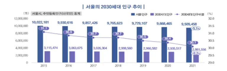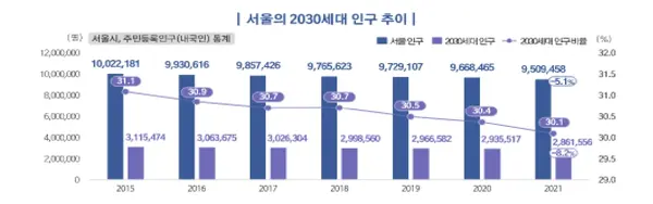 2021년 서울에 2030세대는 남자 140만 명, 여자 146만 명 등 286만 명이 살고 있으며, 서울 인구 중 30.1%를 차지하고 있다.