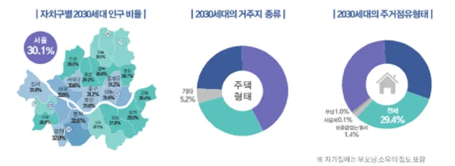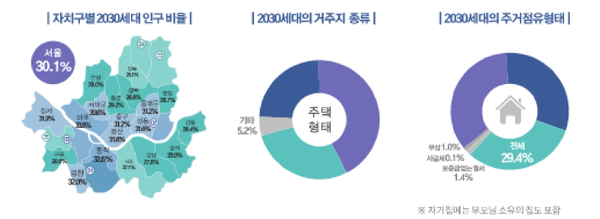 서울 2030세대가 현재 살고 있는 주택은 아파트(42.8%), 다세대/연립주택(28.1%) 순이었다. 주택 점유 형태는 부모님 소유 집을 포함한 자기집(35.8%), 보증금 있는 월세(32.3%), 전세(29.4%) 순으로 조사됐다.