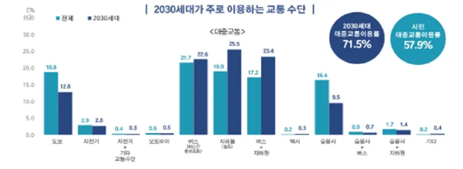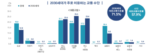 2030세대는 71.5%가 통근·통학을 위해 주로 대중교통을 이용하고 있었다. 시민 전체 평균 57.9%보다 높은 비율로 대중교통을 이용하는 것으로 나타났다.