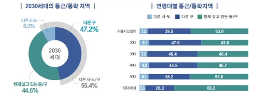 2030세대의 55.4%는 다른 시·도, 서울 시내 다른 구로 통근(통학)하며 일(공부)하고 있으며, 50대 이상이 되어야 직주 근접 환경으로 개선되고 있는 것으로 조사됐다.