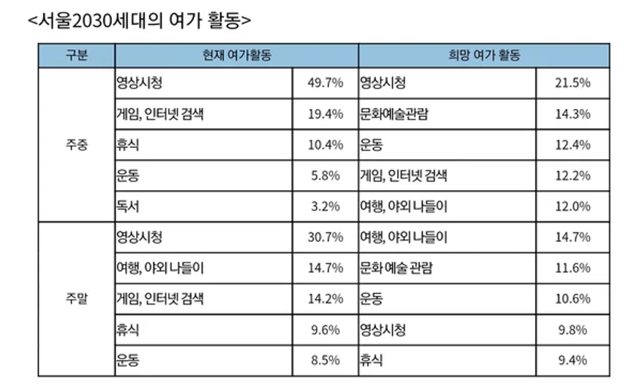 2030세대의 여가생활은 영상시청, 게임/인터넷 검색 등 실내 활동 위주인 반면, 희망하는 여가 생활은 영상시청, 게임/인터넷 검색 등 실내 활동을 줄이고 문화, 여행/야외 나들이, 운동 등의 실외 활동이었다.