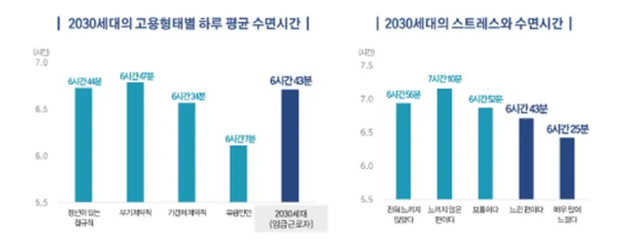 고용 형태에 따라 수면 차이가 있었는데, 고용 형태가 불안할수록 수면시간이 짧은 것으로 나타났으며 수면시간과 스트레스는 연관이 있는 것으로 나타났다.