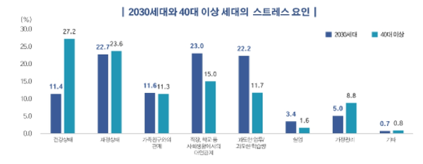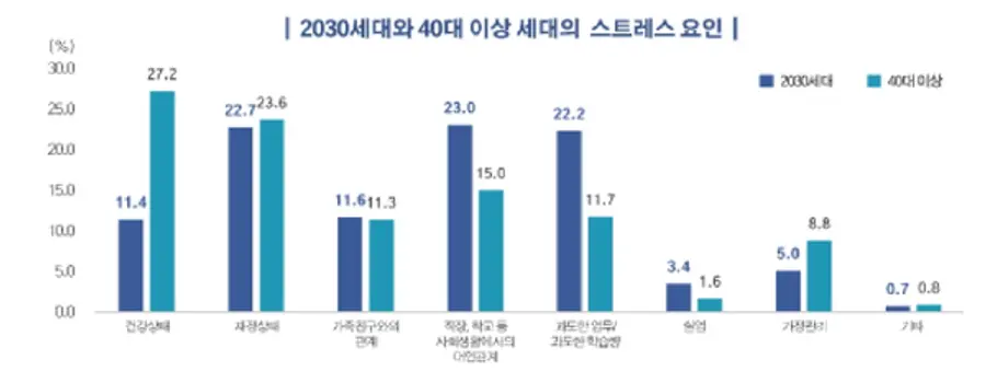 2030세대의 거의 절반인 46.6%가 스트레스를 느끼고 있으며, 주원인은 대인관계(23.0%), 재정상태(22.7%), 과도한 업무/과도한 학습량(22.2%) 순이었다.