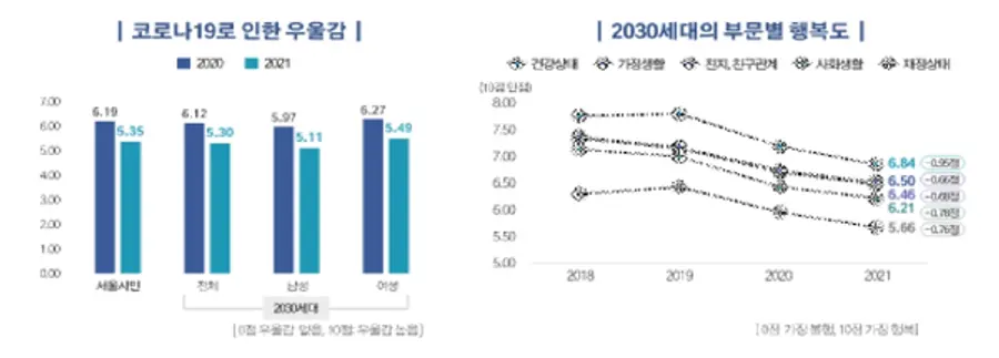 한편 2030세대는 서울 시민 평균보다 코로나19로 인한 우울감을 덜 느끼고 있었으며, 2030세대 남성이 여성보다 우울감이 더 낮았은 것으로 조사됐다.