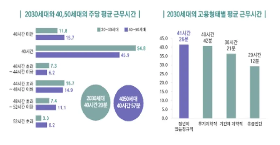 서울시 직업이 있는 2030세대의 주 평균 근무시간은 40시간 20분이었는데, 직업이 있는 4050세대의 주 평균 근무시간 40시간 57분보다 37분 짧았다.
