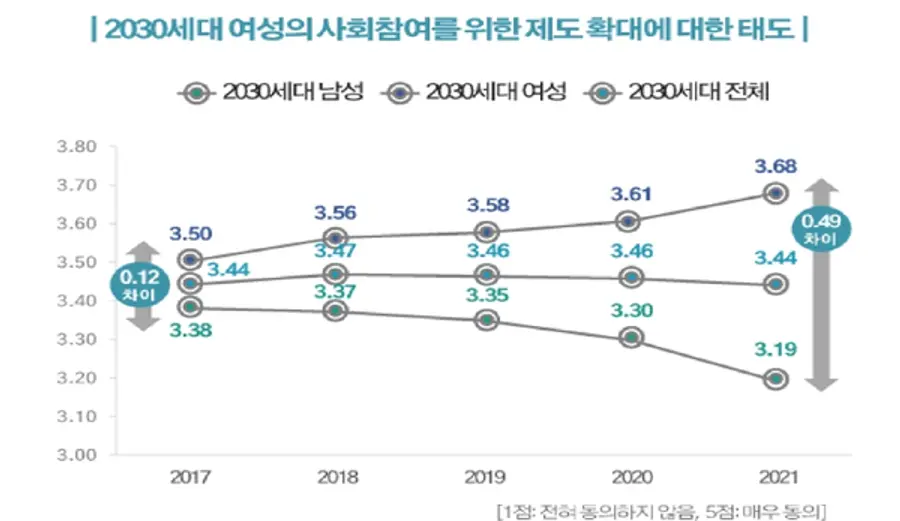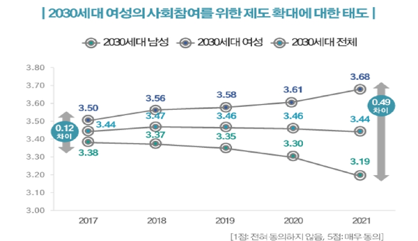 2030세대 내 ‘여성’의 사회 참여에 대한 인식 차이도 존재했다. “여성의 사회참여제도 확대” 정책에 대한 2030세대의 남녀 인식 차이는 지속적으로 증가하는 추세다. 성평등에 대한 공정성 인식 부분에서는 여성이 남성보다 더 공정하지 않다고 생각하고 있었다.