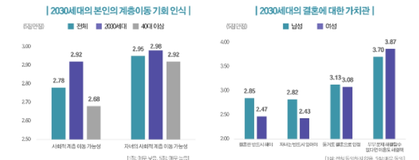 2030세대들이 생각하는 본인과 자녀에 대한 사회계층 이동 가능성은 보통 이하의 수준이지만, 40대 이상이 생각하는 수준보다는 높았다.