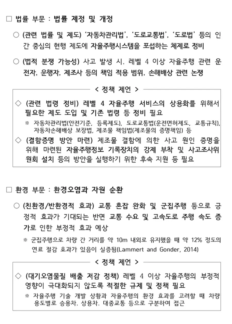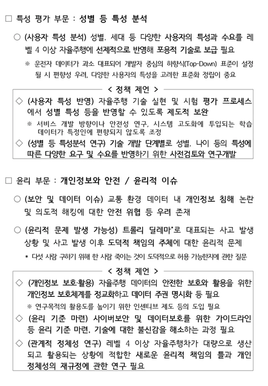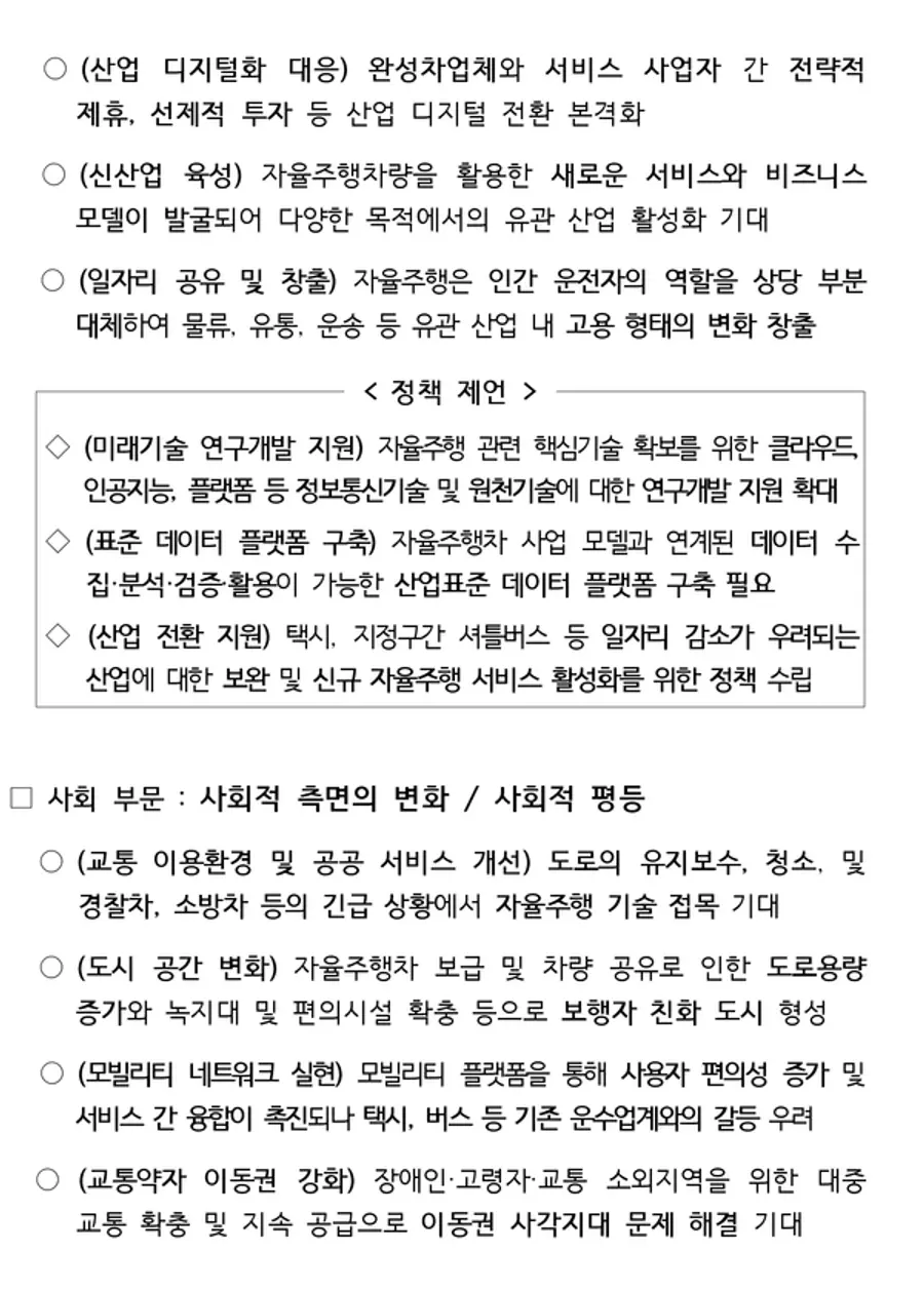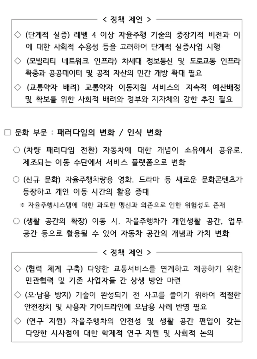이처럼 자율주행 기술 발전으로 새롭게 발생할 여러 측면의 이슈에 대한 전문가 및 시민들의 의견을 책자를 통해 살펴볼 수 있으며, 바람직한 발전과 확산을 위한 여러 가지 정책 제언들도 확인할 수 있다.