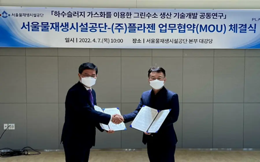 이를 위해 서울물재생시설공단은 지난 7일 폐자원 원료 가스화 기술을 보유한 ㈜플라젠(대표 경국현)과 “하수슬러지 가스화를 이용한 그린수소 생산 기술개발” 공동연구 업무협약을 체결하고 본격적으로 연구에 돌입하였다.