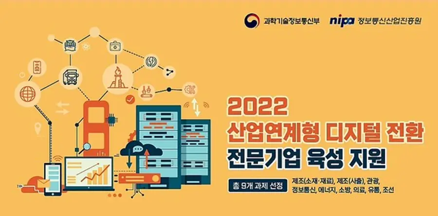 정보통신산업진흥원(원장 허성욱, 이하 NIPA)은 과학기술정보통신부, NIPA가 진행하는 ‘2022년 산업연계형 디지털 전환 전문기업 육성 사업’의 9개 과제를 최종 선정했다고 12일 밝혔다.