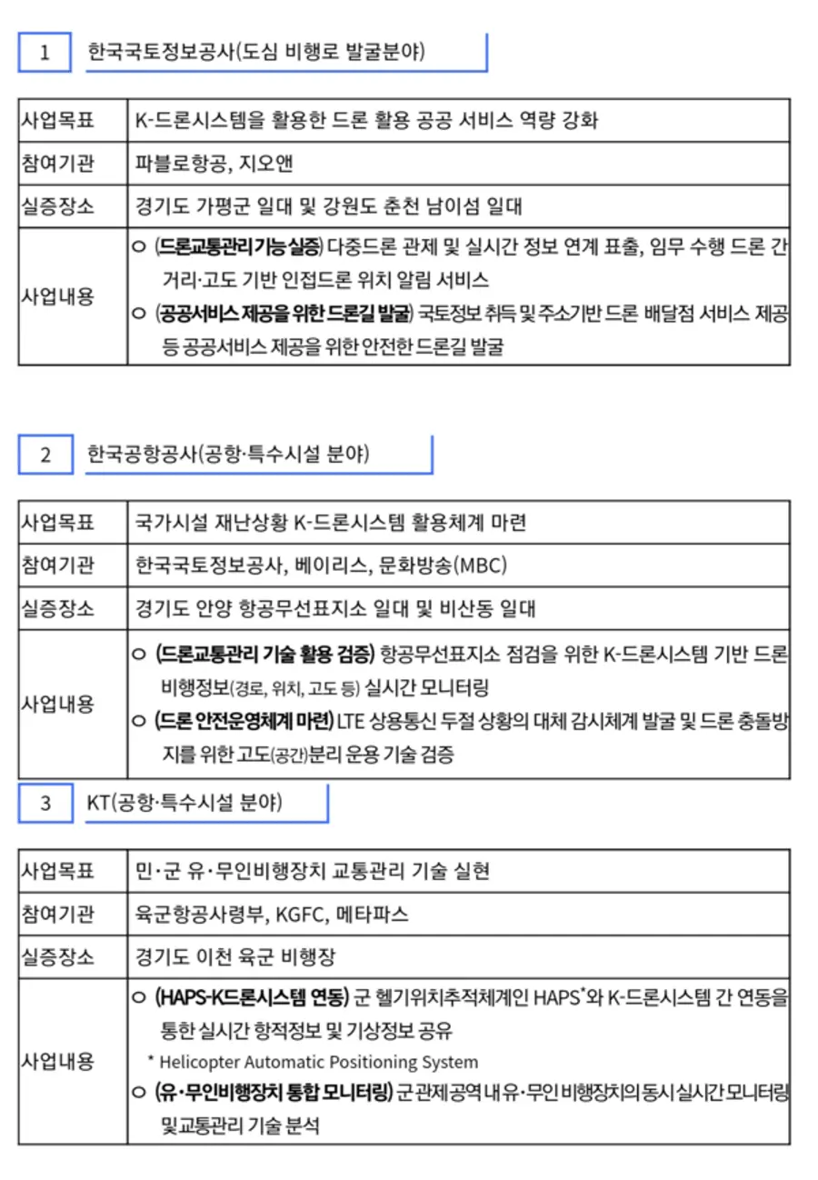이번 실증사업은 실제 사업화 가능성이 크고 안전 확보가 필요한 영역을 중심으로 ▲도심・비행로(한국국토정보공사) ▲공항・특수시설(한국공항공사, KT) ▲공공(한국수자원공사, 한컴인스페이스) ▲민간(시스테크) ▲자유공모(해양드론기술) 총 5개 분야에서 진행된다.