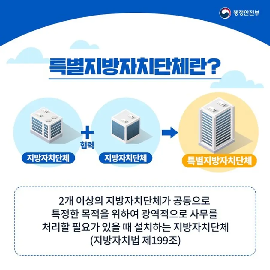 특별지자체는 2개 이상의 지방자치단체가 공동으로 특정한 목적을 위하여 광역적으로 사무를 처리할 필요가 있을 때 설치하는 지방자치단체로, 지난 1월부터 특별지자체의 구체적인 설치 및 운영 근거를 담은'지방자치법' 전부개정법률이 시행됨에 따라 본격적인 제도 활용이 가능해졌다.