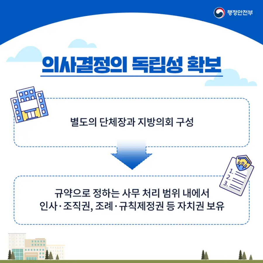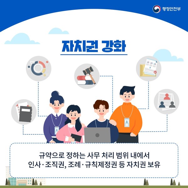 특히, 특별지자체는 규약으로 정하는 사무를 처리하는 범위 내에서 인사·조직권, 조례·규칙제정권 등의 자치권을 가지며 별도의 단체장과 지방의회를 구성할 수 있어, 기존의 행정협의회나 지방자치단체조합과 달리 개별 자치단체의 이해관계를 넘어서는 독립적인 의사결정이 가능하다.