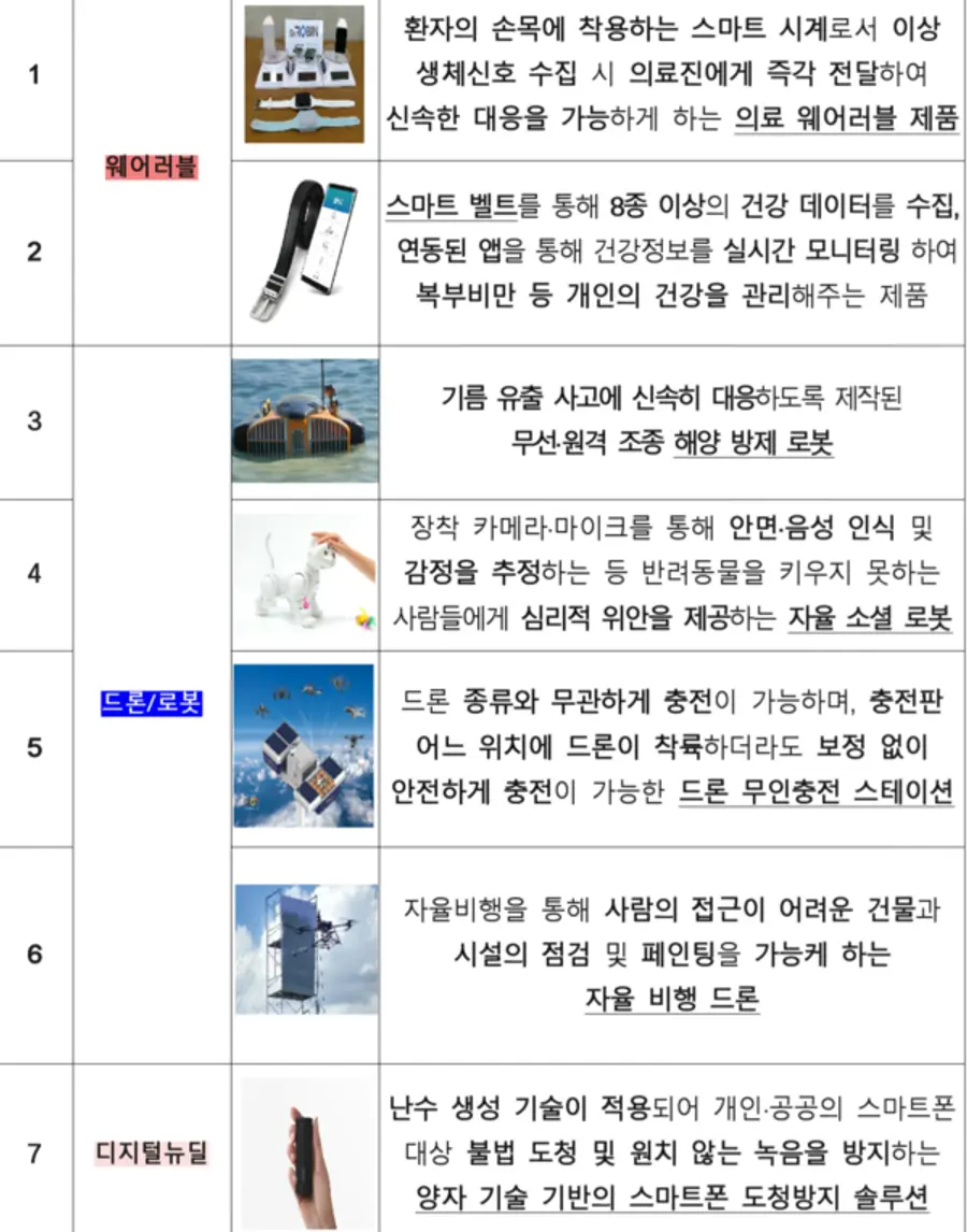 출품된 15개 제품은 웨어러블, 드론·로봇 등 첨단 기술을 적용해 국민 삶의 질을 향상시키는 기술력과 경쟁력을 인정받았다.
