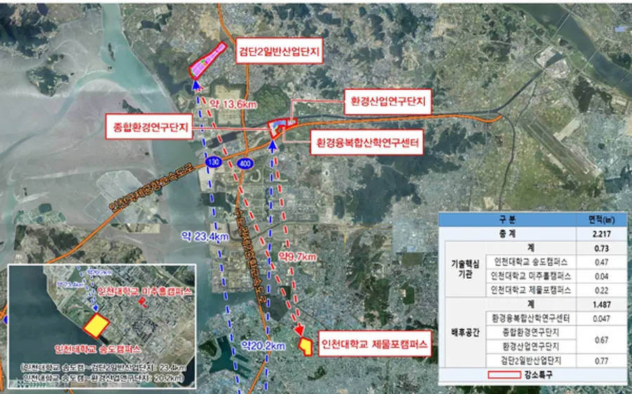 인천 서구 강소특구는 △기술핵심기관은 인천대학교, △배후공간은 종합환경연구단지, 환경산업연구단지, 검단2일반산단(개발예정지) 일부로 구성돼 있으며, ‘정보통신기술 융복합 환경오염 처리 및 관리’를 특화분야로 하는 국내 유일 환경 특화 강소연구개발특구이다.