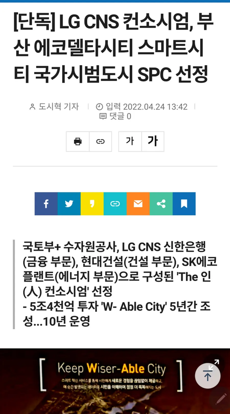 LG CNS는 스마트시티 분야의 대한민국 최강 기업이다. LG CNS는 대한민국 첫 국가시범도시인 ‘세종 스마트시티 국가시범도시’ 구축 사업자로도 지난해 선정된 바 있다. ‘세종 스마트시티 국가시범도시’ 또한 ‘부산 에코델타 스마트시티 국가시범도시’와 유사하게 83만평 규모의 백지상태 부지에 스마트시티를 구축하는 사업이며, 사업규모 또한 약 3.2조원에 달한다. LG CNS는 국토부, LH, 세종시, 컨소시엄 12개사와 ‘세종 스마트시티 국가시범도시’ 구축에 대한 사업시행합의를 지난달 체결했다.