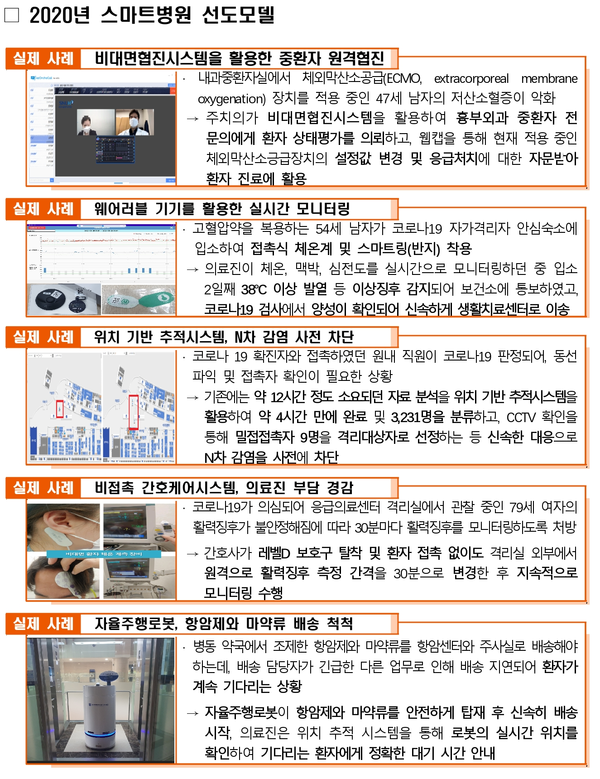 2020년에는 코로나19에 대응하여 의료진 소진, 병원 폐쇄로 인한 진료 공백 등을 극복하기 위해 △원격 중환자실, △스마트 감염관리, △병원 내 자원관리 ‘감염병 대응’ 3개 분야를 지원했다.