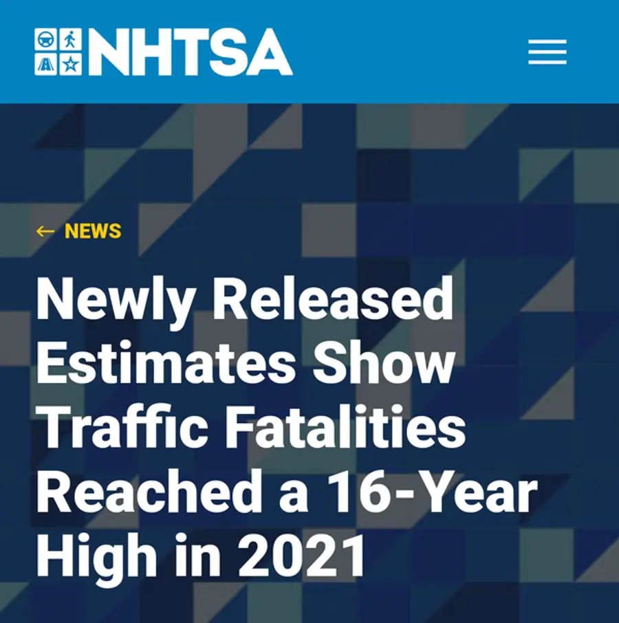 미국 도로교통안전청(NHTSA)이 2021년 미국에서의 교통사고 사망자가 전년보다 10.5% 급증해 16년 만에 최고치를 기록했으며, 특히 도심지에서의 사망 사고가 16% 증가했다는 내용의 잠정 통계치를 발표했다고 포브스 등 주요 외신들이 보도했다.