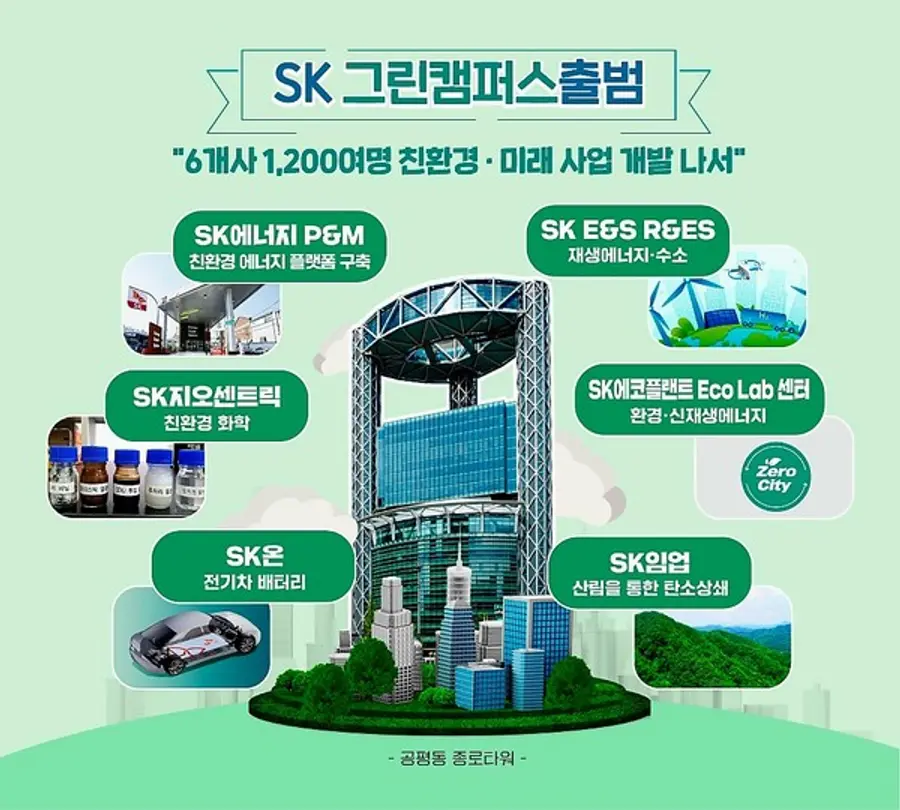 SK그룹이 친환경 사업을 강화하기 위해 관계사 간 경계를 허물고 상시 협업을 통해 미래 신사업 개발 등을 할 수 있도록 관련 관계사들의 인력과 역량을 한 데 모은 ‘SK그린 캠퍼스(Green Campus, 이하 그린 캠퍼스)를 출범시켰다.