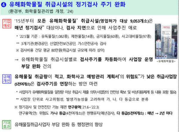 ❹ 위험도가 낮은 유해화학물질 취급시설의 정기검사 주기 완화. (환경부)