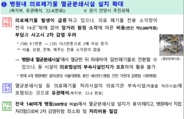 ❺ 의료폐기물을 원거리 소각장에 보내는 대신에 병원내 멸균분쇄시설 설치를 확대하여 처리. (복지부)