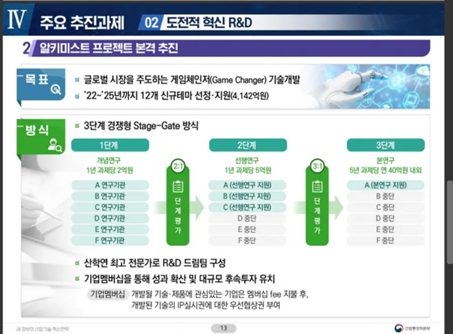 아울러, 미래 산업의 판도를 바꾸는 알키미스트 프로젝트도 올해 3개의 신규테마(노화 역전, 초실감 메타버스 시각화 등)를 시작으로 총 12개의 테마를 선정해 경쟁형 방식으로 ’31년까지 총 4,142억원을 지원키로 했다.