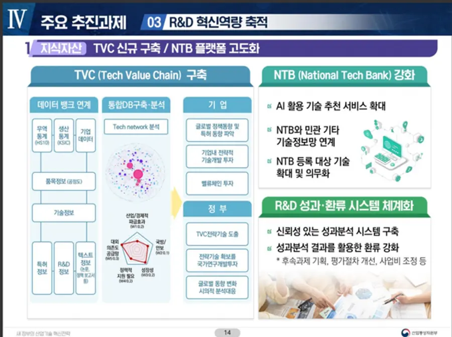 ■ 산업기술 R&D를 통한 인적·물적 자산의 체계적 축적과 활용을 위해 산업기술 가치사슬 플랫폼인 TVC(Tech Value Chain)를 새롭게 구축, R&D 성과물에 대한 분석·환류 시스템 고도화