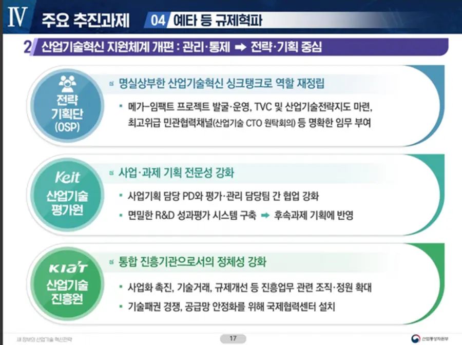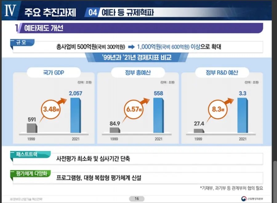 ■ 민간기업의 R&D 수행과정 상 걸림돌이 되는 규제를 적극 해소하기 위해 관계부처 협의를 거쳐 R&D 예비타당성조사 규모를 현행 500억원에서 1,000억원으로 확대 개편하고, 전략과 기획 중심으로 산업기술 지원기관(전략기획단, 산업기술진흥원, 산업기술평가관리원) 체계를 전면 개편