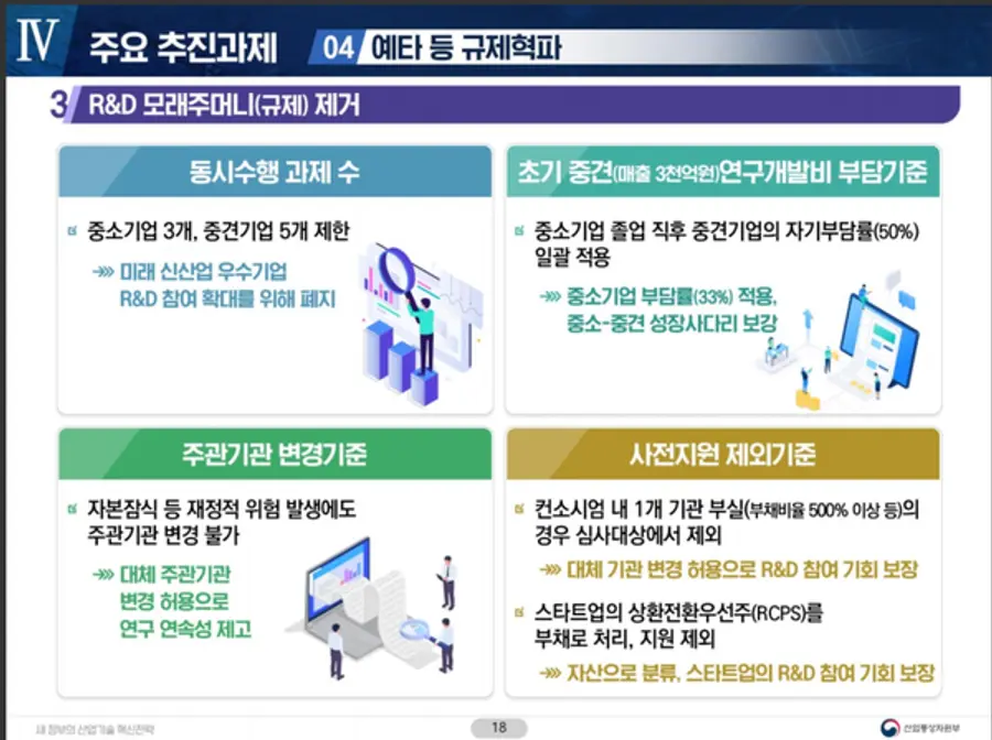 기업 당 동시수행 과제 수(중소 3개, 중견 5개)를 전면 폐지하고, 매출 3천억원 미만의 초기 중견기업의 R&D 자기부담률은 현행 총사업비 50%에서 중소기업 수준인 33%로 하향 조정키로 했다.