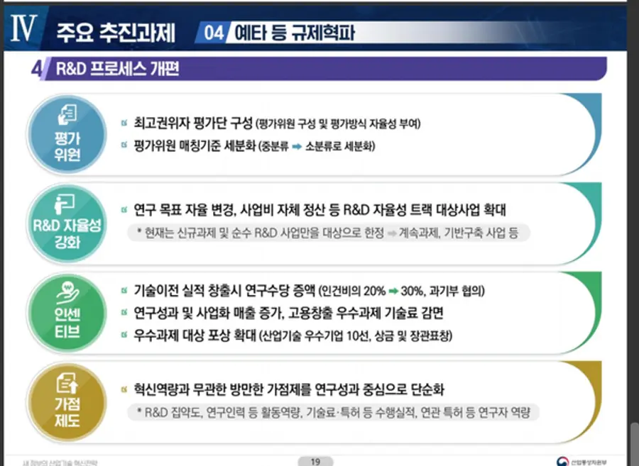 그동안 신규 기술개발 과제에만 한정되었던 R&D 자율성 트랙(연구목표 변경·사업비 정산 등 연구 자율성을 부여) 적용대상을 계속과제, 기반구축 과제까지 확대하고 사업화 매출 우수기업의 기술료를 감면하는 등, R&D 프로세스 전반의 과감한 규제혁파와 인센티브 확대를 병행할 방침이다.