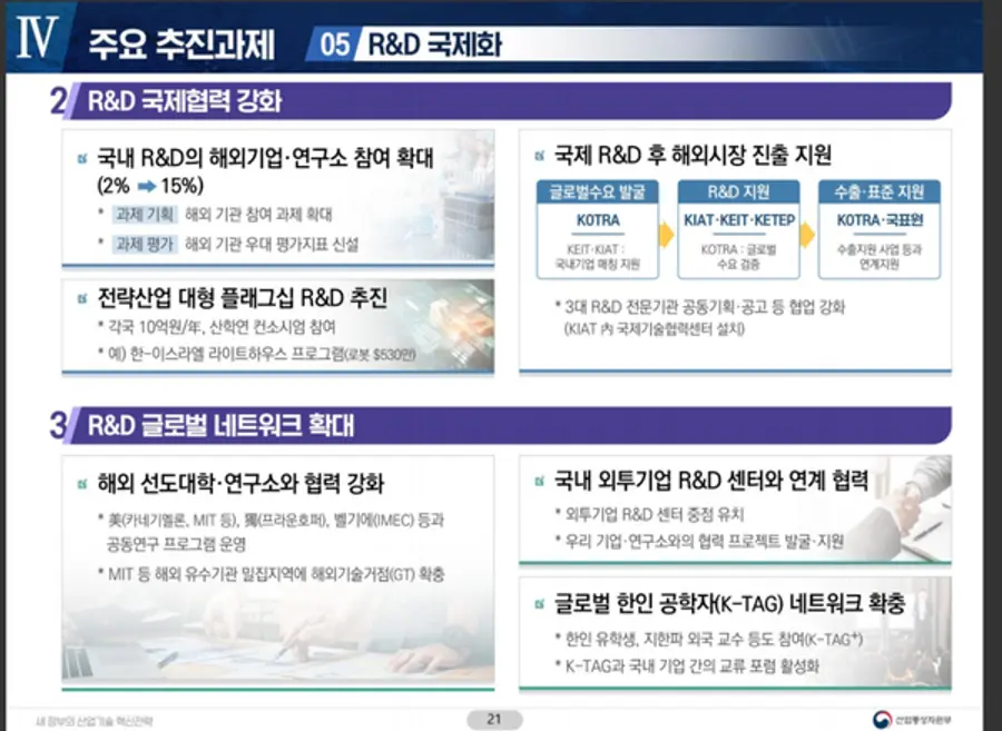 ■ 글로벌 공급망 재편과 국내기업 역량강화를 위해 현재 2% 수준인 국제 공동 R&D 과제(해외기관 참여 과제)는 ‘25년 15%까지 확대