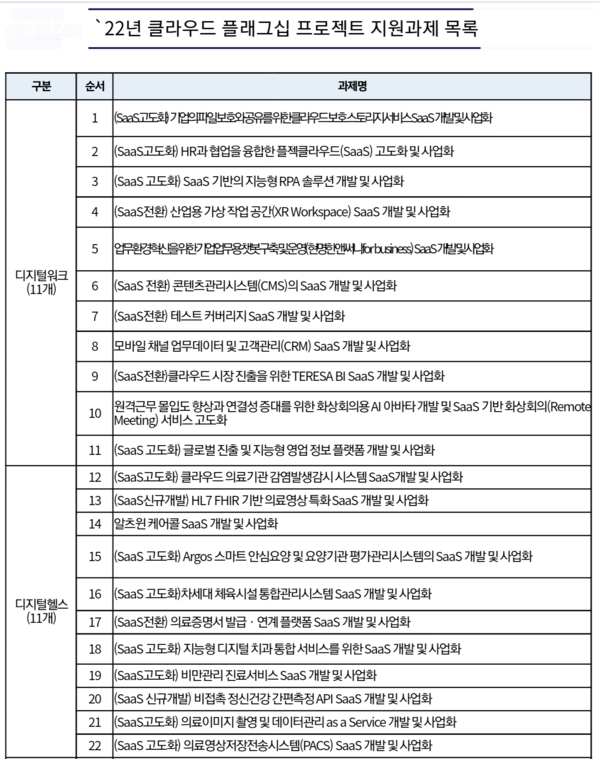 과학기술정보통신부는 정보통신산업진흥원(NIPA)과 함께 국내 서비스형 소프트웨어(SaaS) 개발·확산을 위한 “2022년 핵심산업 클라우드 플래그십 프로젝트” 사업을 20일부터 본격적으로 추진한다고 밝혔다.