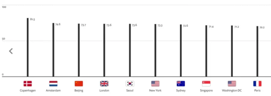 홈페이지 게시글에 따르면 지속가능성 면에서 북유럽 도시들의 우위가 두드러져 노르웨이 오슬로가 1위를 차지했으며, 스웨덴의 스톡홀름이 2위, 덴마크의 코펜하겐이 4위에 올라, 3개 시가 톱5에 들었다. 일본의 도쿄가 3위에 올랐으며, 우리나라 서울은 전체 순위에서 26위였다.