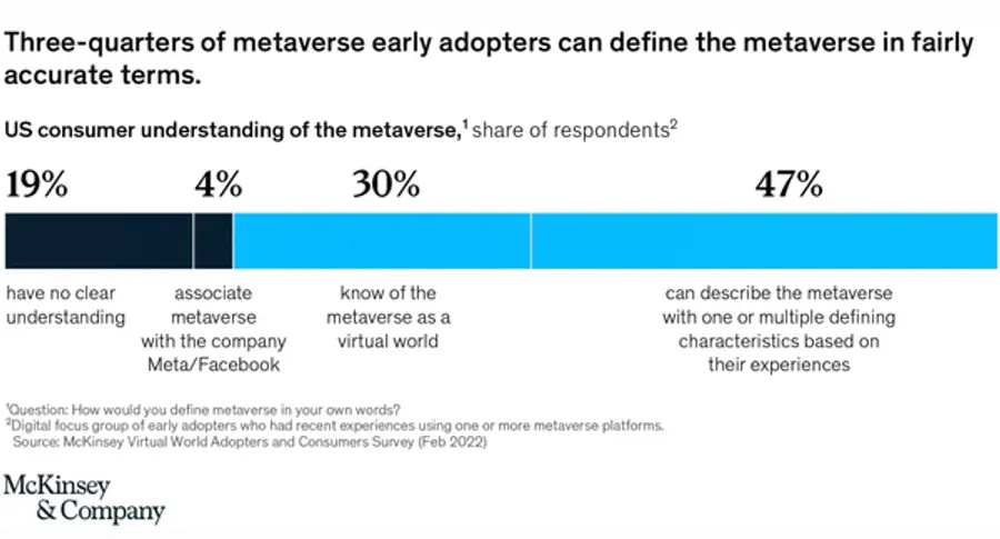 얼리 어답터의 거의 3분의 1이 메타버스를 "사람이 상상할 수 있는 그 무엇도 상상할 수 없는 디지털 세계"로 이해하고 있었지만 작동 방식에 대한 명확한 시각이 부족했다.