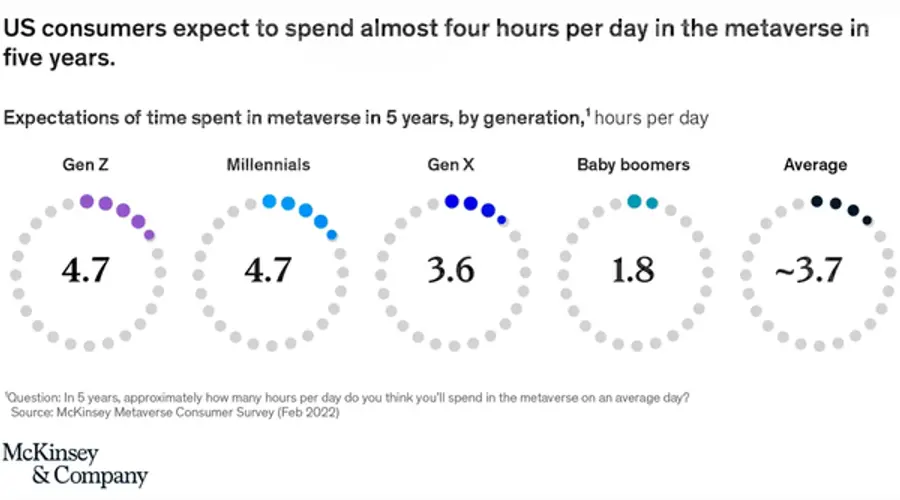 또한 소비자들은 향후 5년 이내에 메타버스가 하루 4시간씩 메타버스에서 보내는 등 일상 생활의 중요한 일부가 될 것으로 기대한다고 말했다. Z세대와 밀레니얼 세대는 하루에 거의 5시간을 보낼 것으로 예상하지만 이전 세대도 메타버스에서 매일 몇 시간을 보낼 것으로 예상했다.