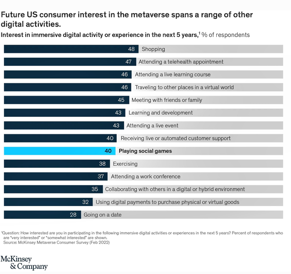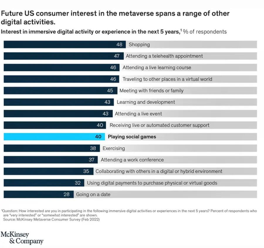 우리는 또한 소비자들에게 미래에 어떤 몰입형 디지털 활동에 관심을 가질 것인지 물었다. 40%는 가상 현실(VR) 또는 AR에서 다른 사람들과 소셜 게임을 하는 데 관심이 있다고 말했다. 이는 앞으로 할 활동 목록에서 9위를 차지했다. 더 인기 있는 관심사에는 몰입형 쇼핑, 예약, 학습, 여행 및 사교 활동이 포함됐다. 또한 우리의 분석에 따르면 소비자 4명 중 약 1명은 다양한 목적으로 가상 세계를 활용하는 메타버스 "수퍼유저"가 될 것으로 전망됐다.