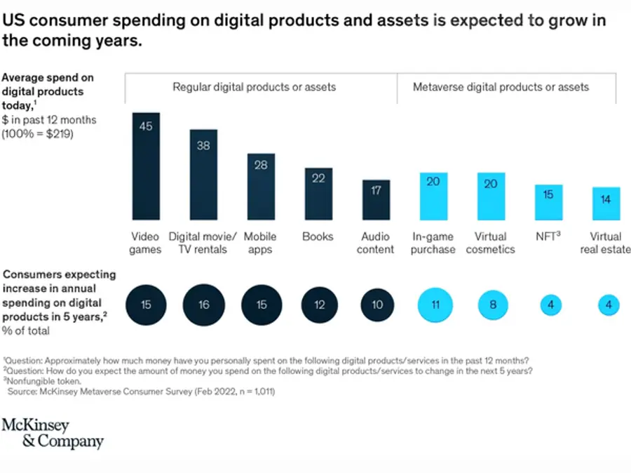 소비자는 평균적으로 연간 219달러를 디지털 자산에 지출하며 이 중 30% 이상이 게임 내 구매, 가상 개선 및 부동산, 대체 불가능한 토큰(NFT)과 같은 메타버스 관련 자산에 사용하고 있는 것으로 나타났다. 소비자는 메타버스 관련 디지털 자산에 대한 지출이 향후 5년 동안 증가할 것으로 예상하며 11%는 게임 내 구매에 더 많은 지출을 할 것으로 예상했다.