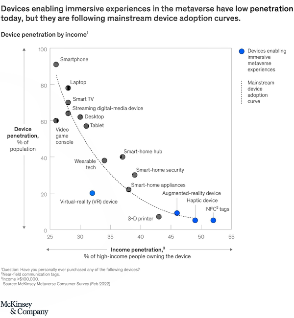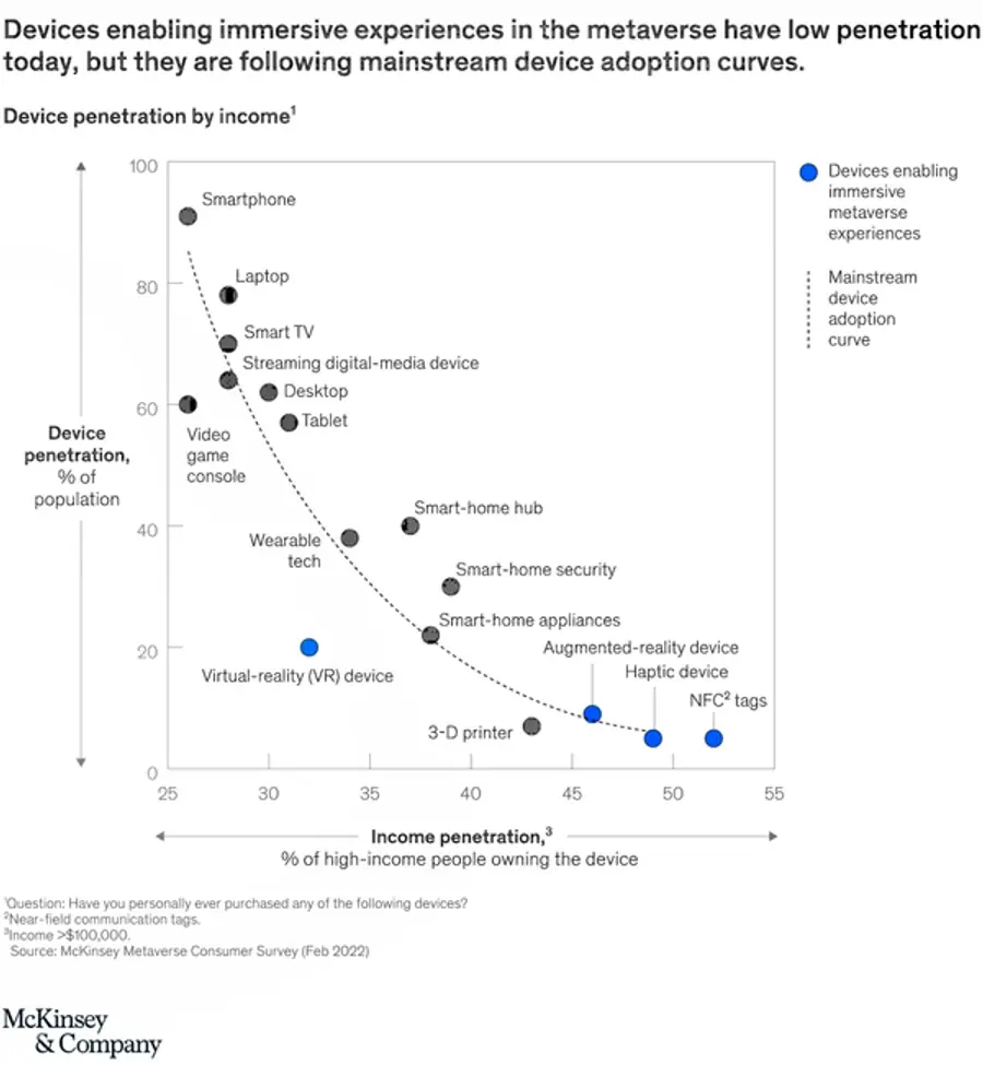오늘날 3D 몰입형 경험을 제공하는 기기의 보급률이 낮은 것이 사실이다. VR은 가장 접근 가능한 기술이지만 보급률이 20%에 불과하다. 현재까지 채택 곡선은 시간이 지남에 따라 널리 보급된 다른 기술의 궤적을 따를 것이다.