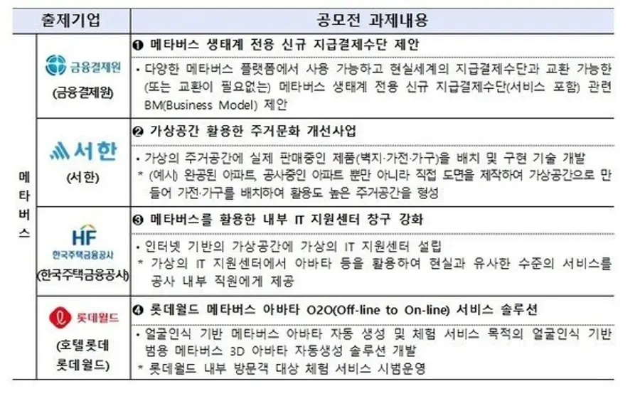 4차 산업혁명 분야에서는 ▲메타버스 생태계 전용 신규 지급결제수단 제안(금융결제원 출제) ▲메타버스를 활용한 내부 IT 지원센터 창구 강화(한국주택금융공사) ▲소각 폐기물 온도 예측을 통한 오염물질 배출 최소화(SK에코플랜트) 등 8개 과제가 제시됐다.