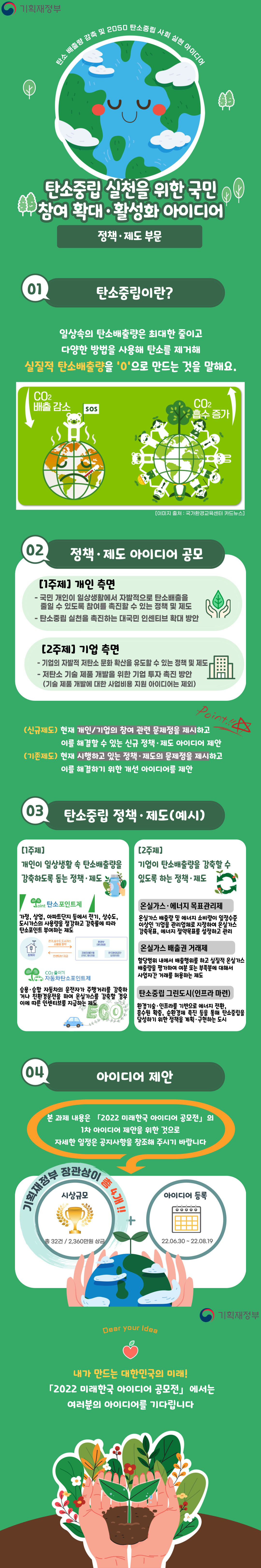 올해는 탄소배출량 감축 및 2050 탄소중립 사회실현을 위한 아이디어를 ▲정책·제도 부문과 ▲기술·제품 부문으로 나누어 공모하며, 국민 누구나 개인 또는 팀(2~4인) 단위로 지원이 가능하다.