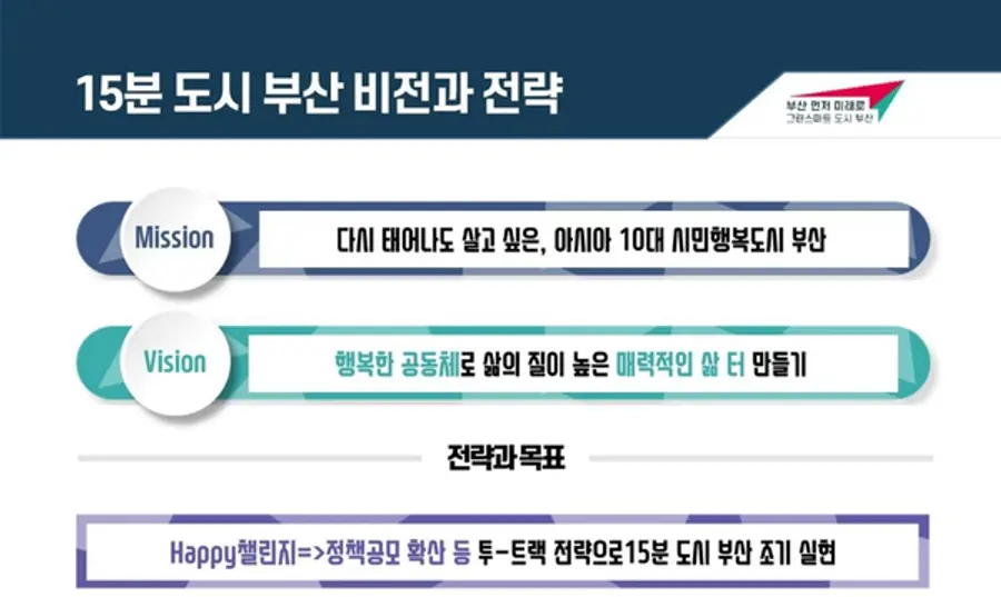 이번에 새로 시작되는 ‘Happy챌린지’는 그동안의 15분 도시 조성사업과 15분 도시 기본구상 용역으로 완성한 ‘15분 도시, 부산’의 가치와 철학을 시가 지난 2002년 이후 축적해온 도시재생사업의 노하우를 바탕으로 시 전역으로 확산하는 ‘마중물’ 프로젝트다.