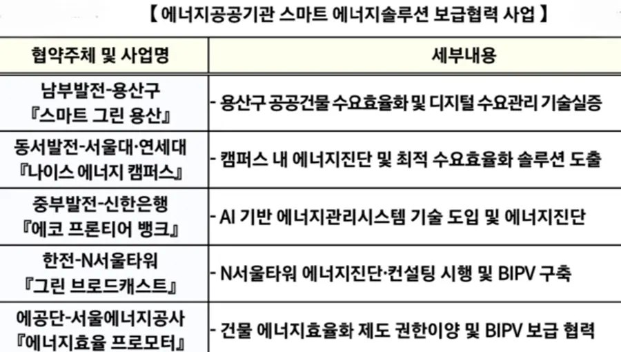 ‘에너지 공공기관 스마트에너지솔루션 보급’ 프로젝트는 발전사를 비롯한 에너지 공공기관이 대학·N서울타워 등 서울시 주요건물에 이엠에스(EMS), 신·재생에너지 등 스마트 에너지솔루션을 시범적으로 지원하는 5개 세부사업으로 구성된다.