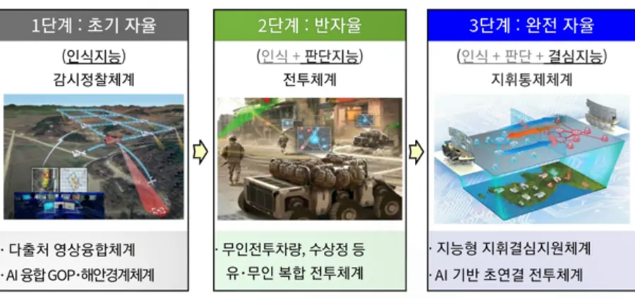 △1단계는 ‘초기 자율형’으로 AI 기반의 다출처 영상융합체계, GOP・해안경계체계를 발전시키고, △2단계는 ‘반자율형’으로 무인 전투차량, 수상정 등 ‘유・무인 복합 전투체계’ 등에 AI 기술을 접목하며, △3단계는 ‘완전 자율형’으로 ‘지능형 지휘결심지원체계’, ‘초연결 전투체계’ 등이 구현될 수 있도록 추진하겠다고 보고했다.