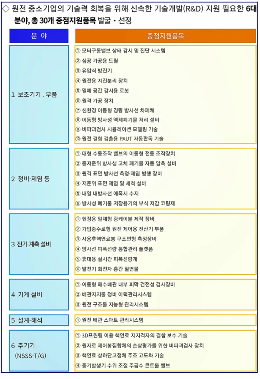 중기부는 원전 분야 중소기업의 기술력 회복을 통한 자생력 제고와 디지털 기반의 미래경쟁력 확보 지원을 위해 올해 7월 12일부터 ’원전 분야 중소기업 기술혁신 연구반‘을 가동했으며, 연구반이 매출‧인력 증감현황, 기업의 기술개발 수요와 기술‧시장 동향 등에 대한 종합적인 검토를 바탕으로 제안한 51개의 중점품목을 확정했다.