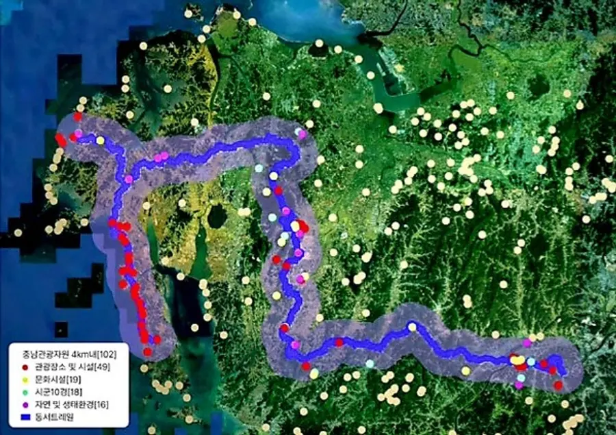 보고서는 △서해랑길, △아라메길, △내포문화숲길, △고마나루길 등 충남에 조성된 걷기 길이 동서트레일과 중첩되는 구간은 115㎞로 분석됐고, 동서트레일 반경 4㎞ 내 연계할 수 있는 문화 관광 자원은 102개가 분포돼 있는 등 지역 관광 산업 활성화와 신규 관광 수요 창출의 기회가 주어질 수 있다고 분석했다.