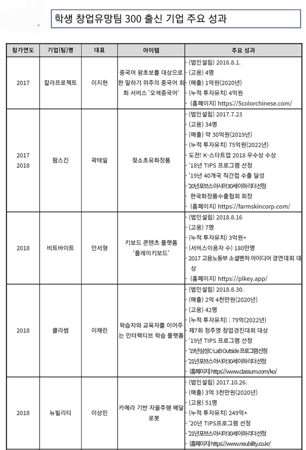 김일수 교육부 고등교육정책실장은 “학생창업팀 300 출신 창업가들이 AI, 디지털 보안 등 디지털 경제 분야부터 서비스, 제조업 분야까지 전 산업 분야에서 뛰어난 가능성과 성과를 보여주고 있다”면서, “앞으로도 교육부는 기업가정신을 갖춘 학생 창업가들이 자신의 꿈을 마음껏 펼칠 수 있도록 적극적으로 지원하겠다”고 밝혔다.