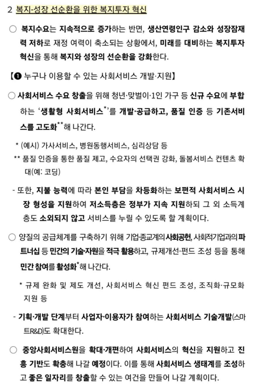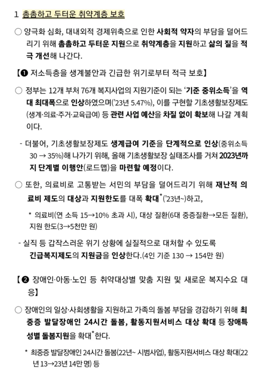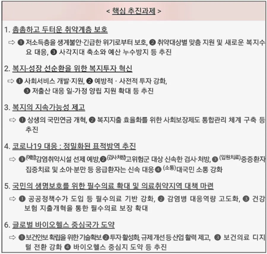 보건복지부는 촘촘하고 두텁게 사회적 약자를 보호하고, 국민 건강과 삶의 질을 향상시키기 위해 ▲촘촘하고 두터운 취약계층 보호 ▲복지-성장 선순환을 위한 복지투자 혁신 ▲복지의 지속가능성 제고 ▲코로나19 대응: 정밀화된 표적방역 추진 ▲국민의 생명보호를 위한 필수의료 확대 및 의료취약지역 대책 마련 ▲글로벌 바이오헬스 중심국가 도약 등 6개 핵심과제를 집중 추진해 나갈 계획이다.